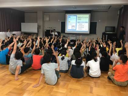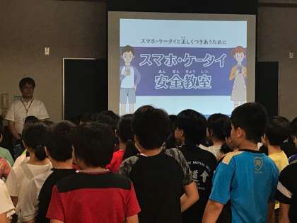 NTTドコモと大阪府警察本部のコラボレーションで5年生を対象に「スマホ・ケータイ安全教室」を実施していただきました。スマホ・ケータイはとても便利な道具であるけれど、使い方を間違えると危険な目に合うということを具体的な事例をあげながら、子どもたちにわかりやすく説明していただきました。最初に、NTTの方に「自分の物とは限らず、家族の物も含めてスマホやケータイを使ったことがある人?」と尋ねられると、ほとんどの子どもが手を挙げていました。SNSに名前、顔写真、住所、生年月日などを掲載すると、個人情報が拡散すること、そのせいでたとえば、旅行中の留守宅に空き巣が入ってしまったことなどをスライドで説明していただいたり、ビデオで見せてもらったりしました。