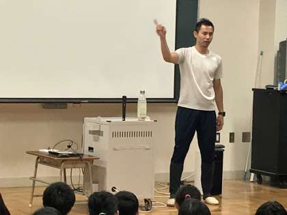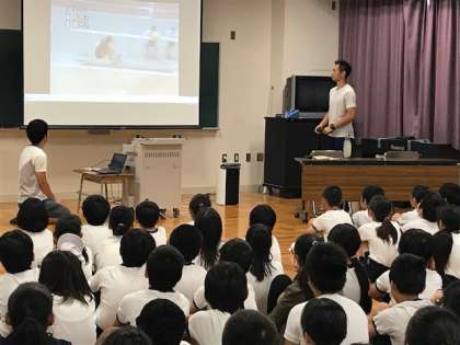 「夢・授業」大阪市がトップアスリートを講師として市立学校に招き、講話や実技指導を通じて、子どもたちの「夢」(目標)をはぐくみ、スポーツへの興味関心を高め、体力の向上を図ることを目的として実施されている事業です。毎年応募していますが、今年度は見事当選し、荒川大輔さんが講師として6年生に授業をしてくださいました。荒川さんは、2007年と2009年の2度、世界陸上に出場されている走り幅跳びを専門とする陸上選手です。日本人9人目の8メートルジャンパーです。