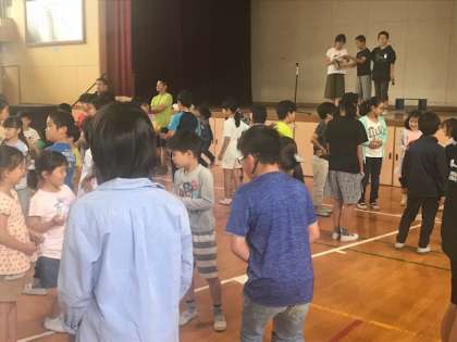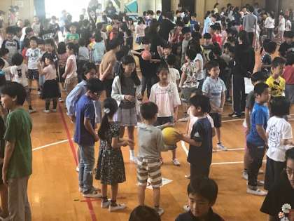 今日は1・3・5年生の児童集会がありました。「ボール送りゲーム」をしました。音楽がなっている間はボールを隣の人に送ります。音楽が止まった時にボールを持っていた人は、大きな声で担任の先生の名前を呼ぶというのが罰ゲームです。自分にボールが回ってきたら、あわてて隣の子にボールをパスする子もいれば、しばらく自分がボールをキープし、頃合いを見計らって隣の子にボールを渡す子もおり、いろいろな楽しみ方をしていました。