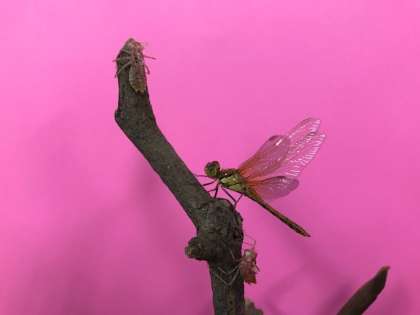 今朝は、校長室で羽化した3匹のトンボが思い思いの場所で、羽を休めていました。残念ながら、1匹は羽を伸ばすことに失敗したようで、うまく飛べません。後2匹は飛び立って行きました。
