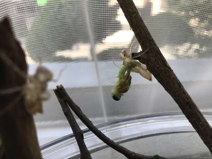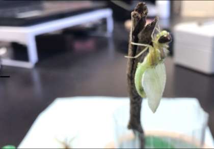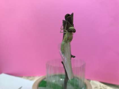 昨日、校長室で、トンボの羽化の様子が観察できました。午前7時50分にヤゴの殻から、トンボが抜け出しました。羽は白く、体全体が丸みを帯びていました。