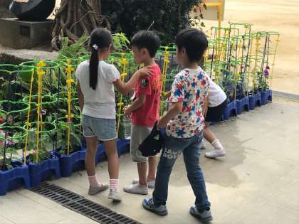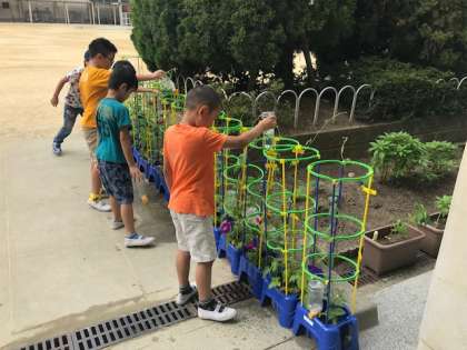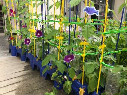 朝、玄関で子どもたちを迎えていると、1年生の子どもたちが「校長先生、僕のアサガオ、二つも咲いてる!」「私はまだ咲いてない。」と自分のアサガオについていろいろと報告しに来てくれます。「よかったねぇ。僕のはどれ?」と尋ねると、自分のアサガオ鉢まで案内してくれます。「このアサガオは何色かな?」「紫に白を混ぜた色。」と説明してくれます。手洗い場でペットボトルに水を溜め、せっせと水やりもしています。種の収穫まで世話と観察をしっかり続けてほしいと思います。