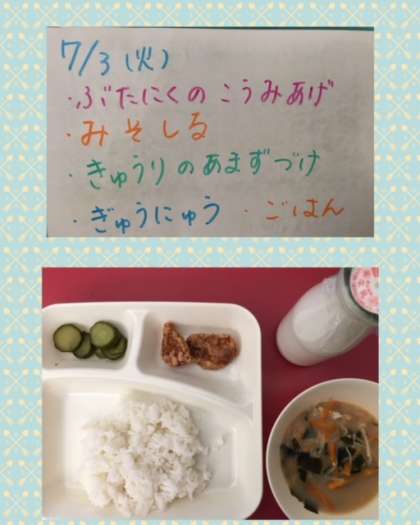 『豚肉の香味あげ』は、豚肉(角)にしょうが汁、料理酒、こい口しょうゆで下味をつけ、でんぷんをまぶし揚げています☆☆☆