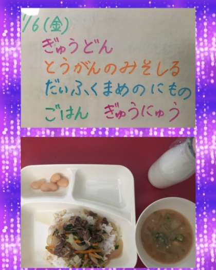 『牛丼』は、牛肉、糸こんにゃく、ためねぎ、にんじん、えのきたけを甘辛くあじつけし、仕上げに青ネギをいれて出来上がりです☆☆☆