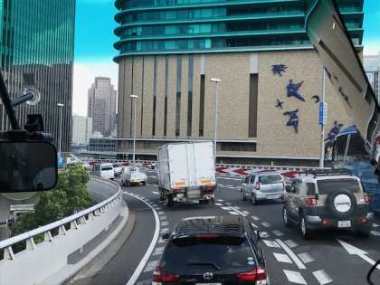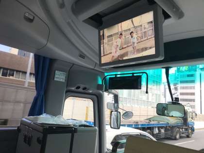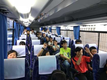 阪神高速道路は、結構 混んでいます。子どもたちは、バスレク係が制作したDVDを鑑賞中です。