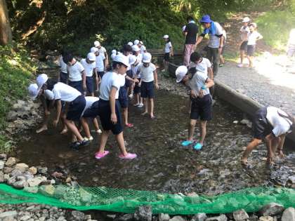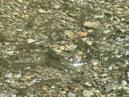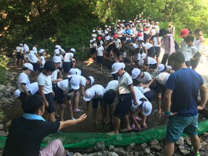 魚つかみが始まっています。元気に泳ぐニジマスを相手に子どもたちは奮闘中です。
