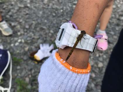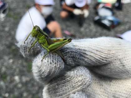焼き板を磨いていると、バッタやトンボが、子どもたちに挨拶に来ます。