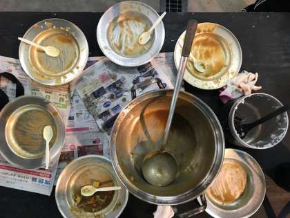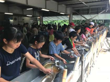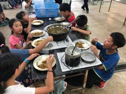 自分たちで作ったカレーライス。飯盒の焦げごはん。子どもたちはおいしそうに食べていました。担任の先生が、各班のルーを少しずつ食べ比べしていました。感想を尋ねると、「同じ材料なのに、みんな味が違う。」とのことでした。食べ終わったら、洗い物です。次の人が気持ちよく使えるように一生懸命洗っていました。