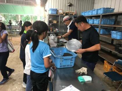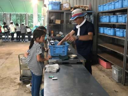食器、鍋などきれいに洗えているかを宿舎の方に点検していただきます。合格した班からおやつのスイカをいただきました。