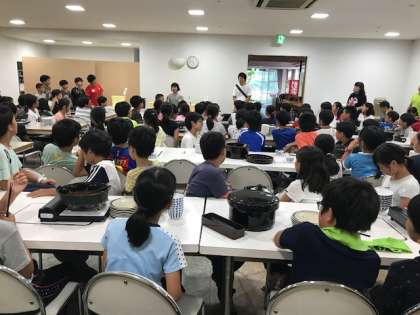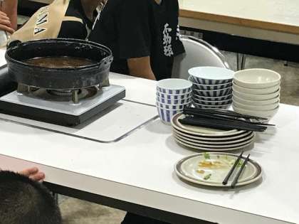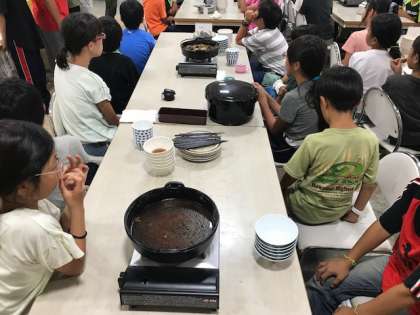 夕食は、すき焼きでした。食べ終わった後は、食器の種類ごとに重ねて、「ごちそうさま」が終わってから、グループのメンバーで手分けして返却します。