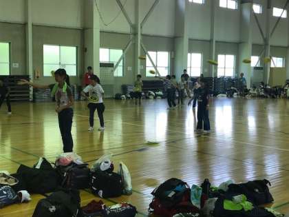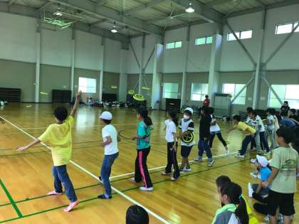「円盤投げ」の様子です。円盤に見立てたフリスビーを二人組で、投げた距離で勝敗を競います。