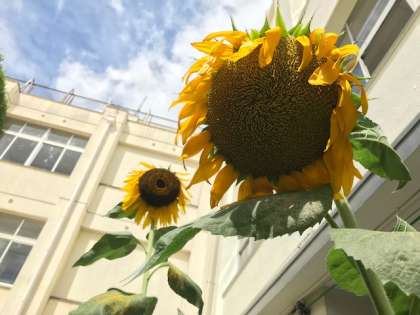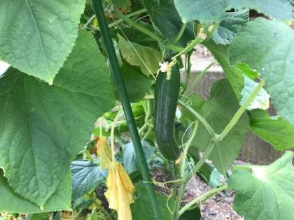 学校ではヒマワリが咲き、キュウリが成長しています。