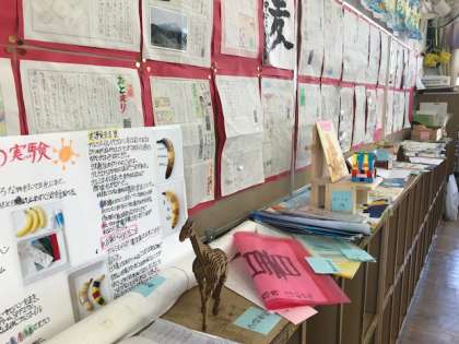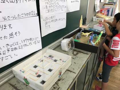 2〜3時限目は、各クラス学級活動をしていました。夏休みの課題の答え合わせや、係活動決めなどをしていました。教室の後ろには夏休みにした自由研究や工作などがいっぱい展示されていました。一つ一つ鑑賞させてもらっていると、近寄って来て目を輝かせながら、自分の作品の説明をしてくれる子どももいました。どれも力作です。子どもたちの気持ちがこもった作品ばかりです。
