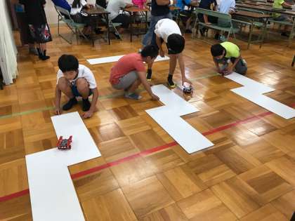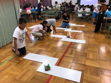 の三つであるというお話をされました。自分だけできればいいのではなく、わからないことは教え合ってみんなができるようにすることが大切。また、将来仕事についたときにやはり、英語でコミュニケーションすることが必要になるので、英語もがんばって勉強しようということも話してくださいました。どのペアも自分たちのロボットがコースからはずれずゴールできるように何度も相談しながら意欲的にプログラミングしていました。コースのスタートからゴールまでうまく動かせたペアには、スタート地点まで戻るという新たな課題が出されます。その課題も見事クリアできた子どもたちからは思わず「僕、天才!」という喜びの叫びが聞かれました。どの子にとっても楽しい学習だったようです。