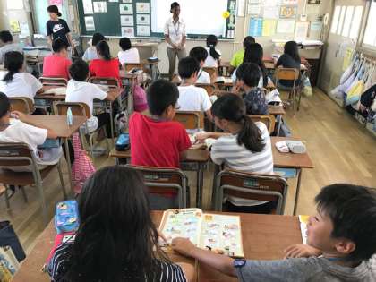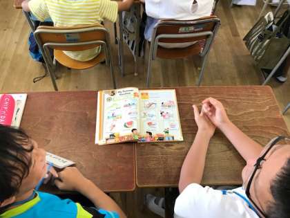 シャネイ先生が、発音された“fishing”“amusement park”“curry and rice”“shaved ice”などの単語を、“I ate 〜 .”か“I went 〜 .”に続けてセンテンスを完成させて発表します。シャネイ先生の発音を注意深く聞き、適切にセンテンスを作ることができていました。