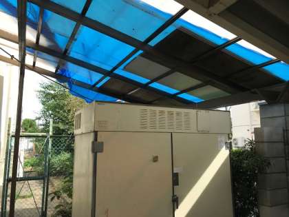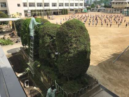 先日、管理作業員さんが夏休みのうちに、各教室のロッカーなどに転倒防止用の金具を取り付けてくれたことをお伝えしました。昨日は、台風21号で飛んでしまった給食室の屋外冷蔵庫の覆いを緊急補修してくれました。毎日約800人分の食材を保管する大切な冷蔵庫です。雨がかかると漏電の危険があるということで、急遽工夫して覆いを作ってくれました。また、校庭の樹木の剪定を順にしてくれていましたが、今日、最後のカイヅカイブキが終わりました。明日以降は、校舎外側の樹木選定を行う予定だそうです。
