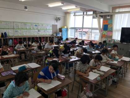 本校では、昨年度より、清掃時間の後、5限目までの15分間を「ぐんぐんタイム」と名付けモジュール学習を行っています。月・水・金曜日は「英語」火曜日は「視写」木曜日は「読書」です。今日は「視写」でした。約10分間でその日の課題を視写し、書き終わった子どもから先生に見てもらい、丸を付けてもらったり、シールを張ってもらったりしていました。
