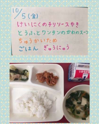 小麦アレルギーの児童の為、ワンタンの皮の個別対応献立となっています!!!