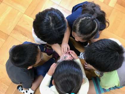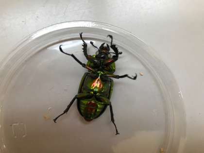 始めに、「ニジイロクワガタ」を見せていただき、その美しさに大喜び、お腹まで輝いているのを見て、再び大喜びしていました。「たくさんいると、中に変わった個体が現れます。今日持ってきた12匹の中に2匹だけ眼が白いメスがいます。」と言うお話に、自分たちのグループのクワガタの眼の色を確かめる子どもたち。