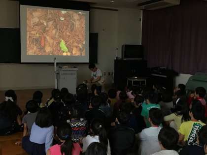次に、国語で学習した「自然のかくし絵」のように、周りの風景を真似している昆虫たちや、昆虫の化石などについて映像を活用して説明していただきました。昆虫が好きな子も、苦手な子もしっかりお話を聞いていました。
