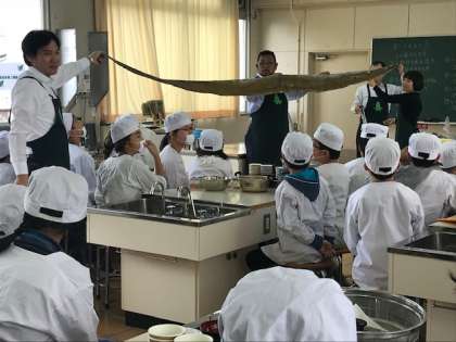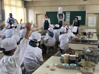 先週の金曜日10月12日に、「大阪昆布商工業協同組合」から4名のゲストティチャ—にお越しいただき、5年生が調理実習を行いました。
