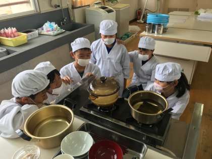 また、透明な鍋でご飯が炊ける様子を観察しながら、昆布と鰹節でとっただしでおいしいみそ汁を作るのをサポートしていただきました。先週は2クラス、明日残りの2クラスが実習を行います。