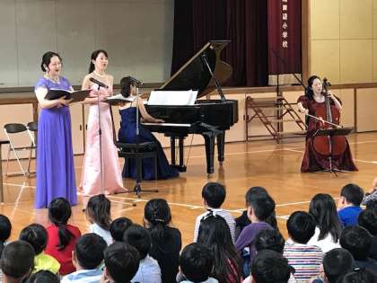 今日は「南田辺コンサート」が開催されました。昨年度までは3学期に土曜授業として実施していましたが、今年度は、「文化の秋」の10月に実施することにしました。保護者の方を含む4名のゲストティチャ—にお越しいただき、美しい歌声と、すばらしいピアノとチェロの音色を聴かせていただきました。