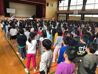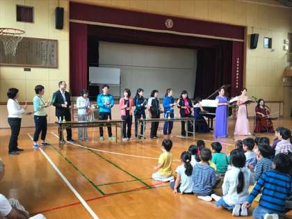 知っている曲の時には思わず口ずさむ子どもも見受けられ、音楽の世界に入り込んでいました。2時限目は1・2・3年生でした。先生も「きらきらぼし」をミュージックベルで即興で演奏しました。先生たちの真剣な演奏に子どもたちも嬉しそうでした。