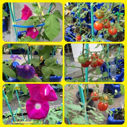 梅雨空の重い雲の下、1年生の育てる朝顔は色鮮やかな花々を、また2年生の育てるプチトマトは瑞々しい真っ赤な実を鈴なりにつけ、校庭の景色に彩りを添えています。