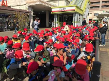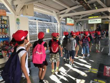 晴天に恵まれ、今日は3年生の遠足です。三国ヶ丘駅で乗り換え、今、金剛駅に着きました。お茶タイムの後、錦織公園に向けて出発します。