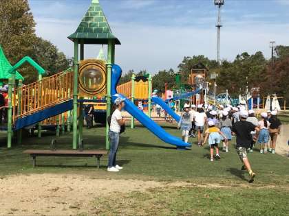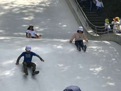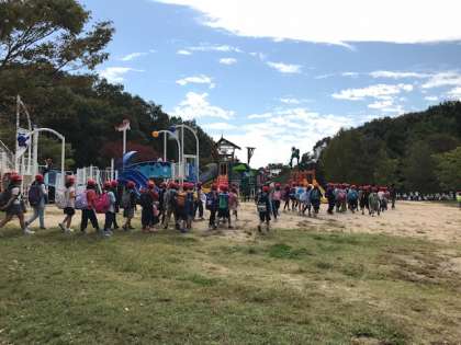 という声もちらほら聞こえてきていましたが、子どもたちは今「水辺の里」で、遊具を使って思い切り遊んでいます。幼稚園児、他の小学生などで大賑わいですが、南田辺の子どもはルールを守り、上手に遊んでいます。