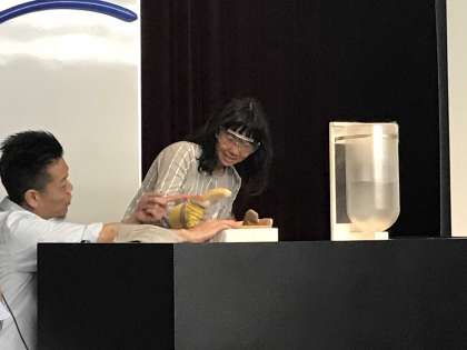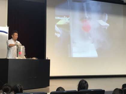 始めの実験は「液体窒素」の中にバナナ、ゴムボール、風船を入れるとどうなるか、予想を立て、実験して、結果から考察します。カチカチに凍ったバナナを金づちがわりにして釘を打ち込んだり、カチカチになったゴムボールを金づちで叩くと粉々になる様子を見せてもらったりしました。