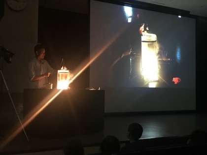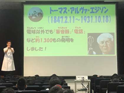 二つ目の実験は、電球のフィラメントに関する実験でした。電球はエジソンが、発明したこと、その際フィラメントに使ったのは京都の竹であること、質問されるたびに的確に答える子どもたち。すごくよく知ってるなと思ったら、3年生の理科の教科書に載っていたとのこと。でも、よく覚えていました。今日は、シヤプペンシルの芯を使って灯りを灯されました。空気中では、燃えて、切れてしまいましたが、液体窒素の中では、いつまでも赤々とと光を放っていました。