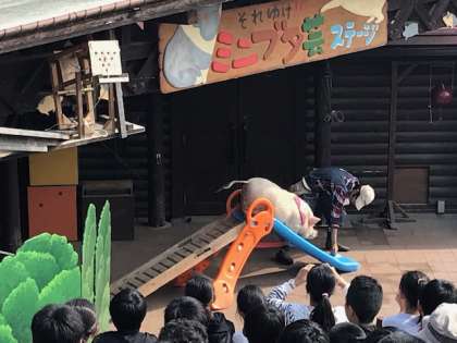 食事の後はミニブタショーを見せてもらいました。ハードルを飛び越えたり、滑り台を滑ったりミニブタさんたちが、大活躍でした。