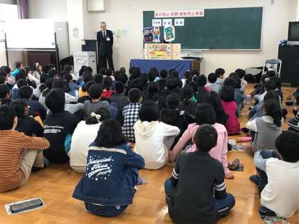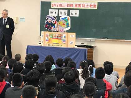 難波少年サポートセンターからお二人の方がお越しいただき、5年生の子どもたちに、「非行防止・犯罪被害防止教室」をしていただきました。ペープサートで万引きは犯罪であることを子どもたちに語りかけてくださいました。主人公は「スマイルくん」今までに悪いことはしたことがない5年生の男の子です。お店で前からほしかったゲームの本を見つけます。でも、お小遣いは使ってしまってもうありません。「スマイルくん」の心の中で葛藤が起こります。「とってしまえばいいじゃないか。」とささやく悪魔くん。「だめよ、だめだめ。」と止める天使ちゃん。悪魔くんのささやきに負けた「スマイルくん」は、悪いことだと分かりつつ万引きをしてしまいます。