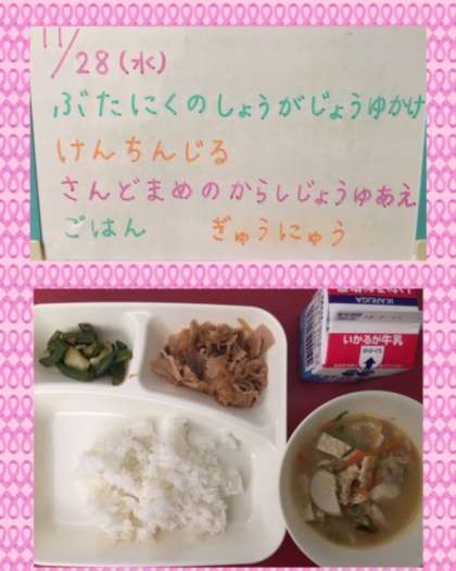 『豚肉のしょうがじょうゆかけ』は、焼き物機で焼いた豚肉に、しょうがをきかせたタレをからませています☆☆☆