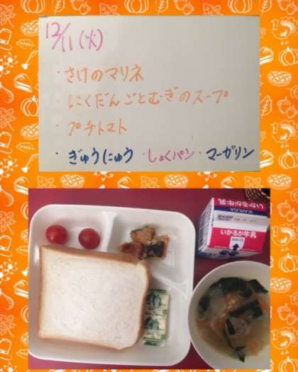 『さけのマリネ』は、塩、白こしょうで下味をつけ、でんぷんをまぶして油で揚げた角切りのさけに、たまねぎの入ったマリネ調味料にからませます☆☆☆