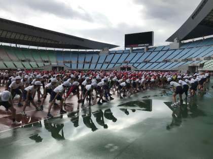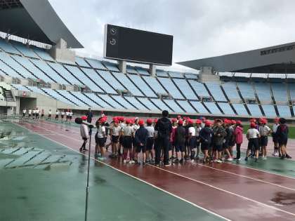明け方はまだ、雨が降っており、実施すべきか否か迷っていましたが、回復傾向にあるという天気予報を頼みに、実施に踏み切りました。「ヤンマースタジアム長居」のトラックにはまだ水分が残っていましたが、世界の一流選手がタイムを競うトラックで、準備体操を行い、子どもたちはスタートに備えました。たくさんの保護者の方々が子どもたちの応援に来てくださいました。