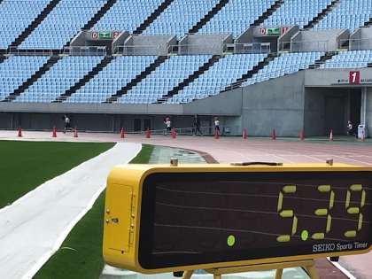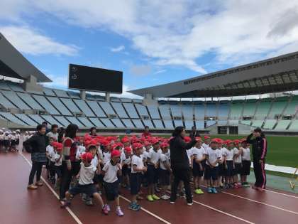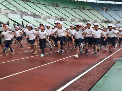 1年生は初めての持久走大会です。担任の先生から、ゴールの位置、2周走りきることなどを話していただいた後、スタートしました。1年生は2周(800メートル)、2年生は3周(1200メートル)完走することが目標です。2年生がゴールする頃、南東入口付近からスタートし外周を走ってきた3年生の先頭集団が競技場ゲートをくぐってきました。3年生は約1600メートルを走りました。