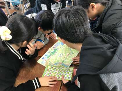 税金には「所得税」「法人税」「消費税」などがあり、その税金で、みんなが豊かに、安全に暮らせるようにさまざまなところに活かされていること、税金の始まりは弥生時代にさかのぼることなどを教えていただきました。その後、「まちをつくろう!!」というテーマの地図に「スーパーマーケット」「図書館」「寺」「消防署」など32枚あるシールの中から町にあればいいなと思う施設のシール15枚をグループで相談して選び、貼っていきながら町づくりについて考えました。