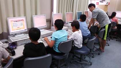 写真は「パソコンクラブ」です。パソコンを使って文章を書いたり絵を描いたりして楽しんでします。今日は1学期のふりかえりをパソコンでうちました。ローマ字入力で苦労しながらも、一生懸命に打ち込むことができました。