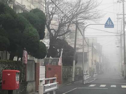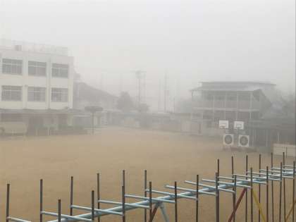 今朝は、珍しく霧が立ち込めていました。子どもたちも霧の中、登校してきました。