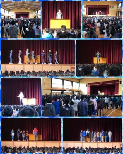今日は2学期の終業式です。皆さん2学期は何日間学校へ登校したと思いますか?81日間です。その間にいろいろなことを勉強しました。できることが増えたことと思います。終業式は自分はどんなことができるようになり、まだ、苦手なことは何だろうと振り返る日です。この後、各教室で担任の先生から「通知表」をいただきます。人と比べるのではなく、自分は何が身に付き、これからはどんなところを頑張らないといけないかを振り返りましょう。冬休みは年末年始で楽しいことがいっぱいあると思います。年末は、大掃除などお家のお手伝いもあると思います。家族の一員として、進んでお手伝いしましょう。また、自分ががんばらないといけないところをお家で学習しておくと3学期のスタートがスムーズに切れますよ。楽しい冬休みを過ごしましょう。
