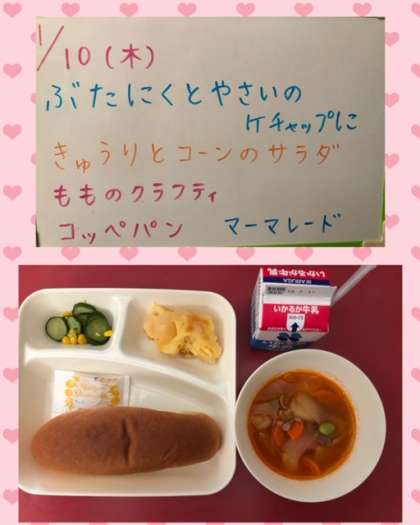 『豚肉と野菜のケチャップ煮』は、豚肉を主材に、じゃがいも、たまねぎ、にんじん、青みにむき枝豆を使用したボリュームのある洋風の煮ものです♪♪♪