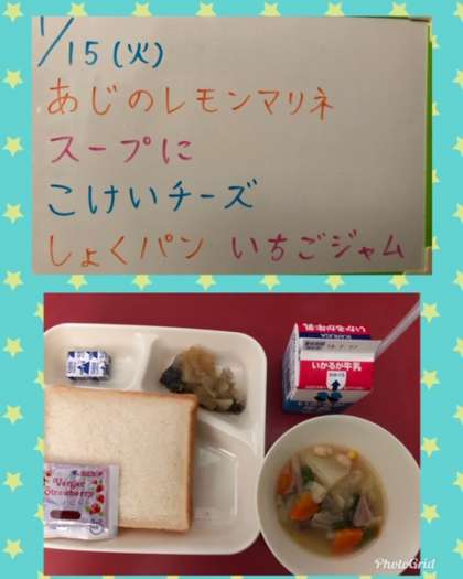 『あじのレモンマリネ』は、あじをから揚げにし、炒めたたまねぎとレモン汁、酢、砂糖、塩、料理用ワインを煮て作ったマリネ液を揚げたあじにかけて食べます☆☆☆