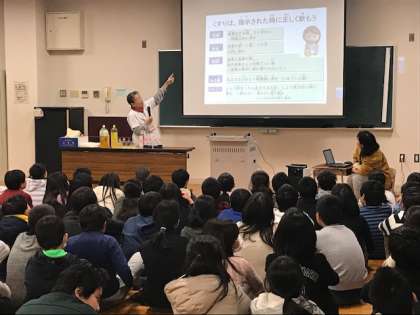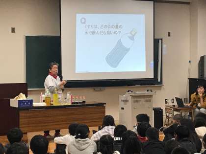 6年生は、学校薬剤師さんに「お薬教室」をしていただきました。お薬は水やぬるま湯で服用すること、ジュースやお茶で飲むと薬が変質してしまうことなど、お薬について気を付けることを教えていただきました。