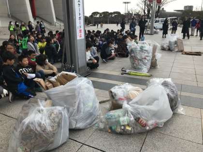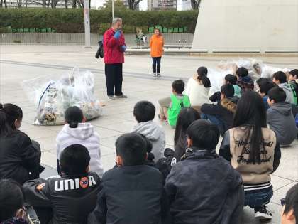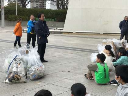 拾ったごみは、「ビン・缶・ペットボトル」と「それ以外のごみ」に分別し、クラスごとに集めました。東住吉区長さんに判定していただいた結果は1位ー1組、2位ー3組、3位—2組、4位ー4組でした。最後は長居パークセンターの方に収集していただきました。区長さんからは、「『大阪の人』『日本中の人』『世界の人』が使うこの長居公園は地域の財産です。みんなで大切にするという意味でこの取り組みは意義があります。それと、このプロジェクトを実行するにあたってたくさんの人が支援してくれていることも忘れないでください。」と言うお話をして頂きました。また、連合町会長さんは、「ごみをほっている大人がいることがはずかしい。まずはごみをほらないこと、そのうえで落ちているごみは拾ってきれいな町にしましょう。」と言うお話や、「昔はここに競馬場があったんですよ。」というお話もしてくださいました。
