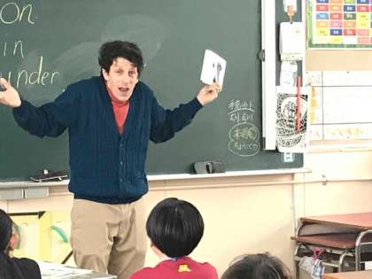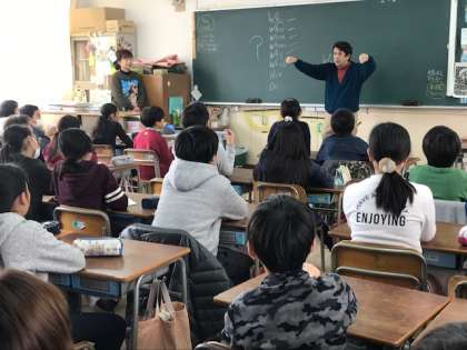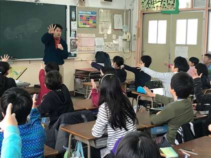 昨日、4年生はマッシュ先生と英語活動をしました。“on”“in”“under”“behind”の学習をしました。