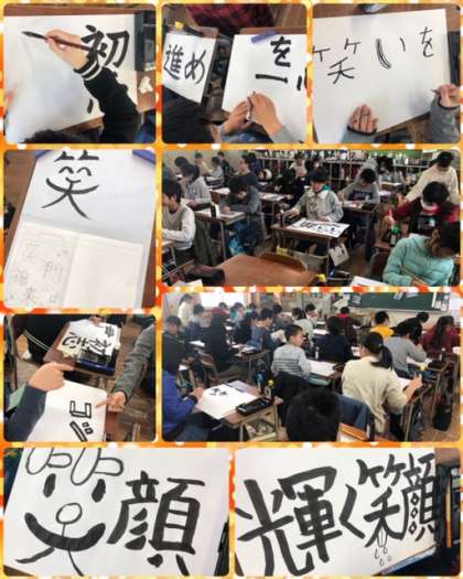 本日の学習参観の時に講堂に掲示している作品を筆を使って書いている様子です☆☆☆