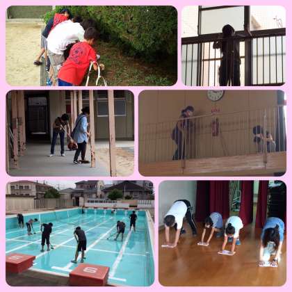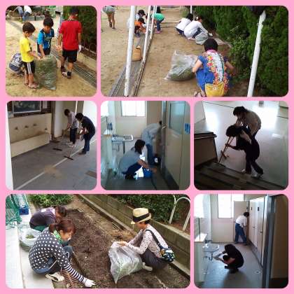 夏休み最後の日、たくさんの保護者の方々に集まっていただき、教職員や南田辺FCまたミニバスとともに、廊下・階段やトイレなどの掃除や、草ぬきなどをしました。